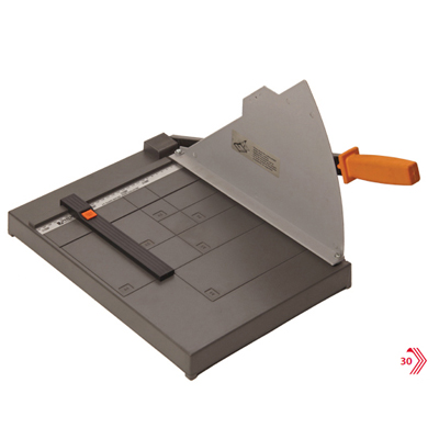 Lightweight plastic base is marked with grid lines, measurements and paper guides for an accurate cut